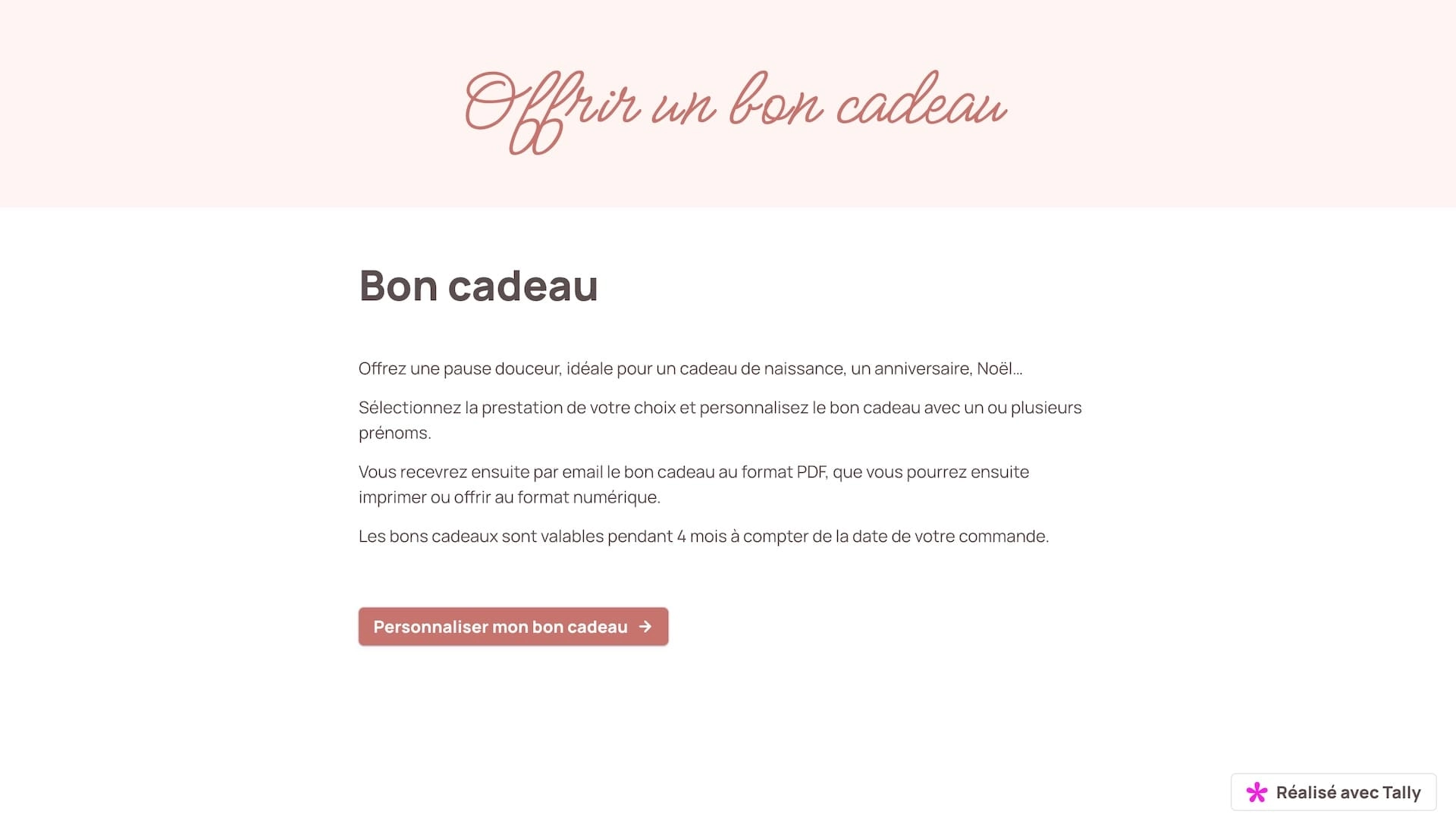 Amandine souhaitait une solution aussi simple et intuitive que possible, tant pour elle que pour ses clients. Il était important pour elle de pouvoir personnaliser les bons cadeaux avec les prénoms (”De la part de…” et “Pour…”) et avec des informations spécifiques selon la prestation choisie. Ces informations devaient également être rappelées dans le formulaire de commande.