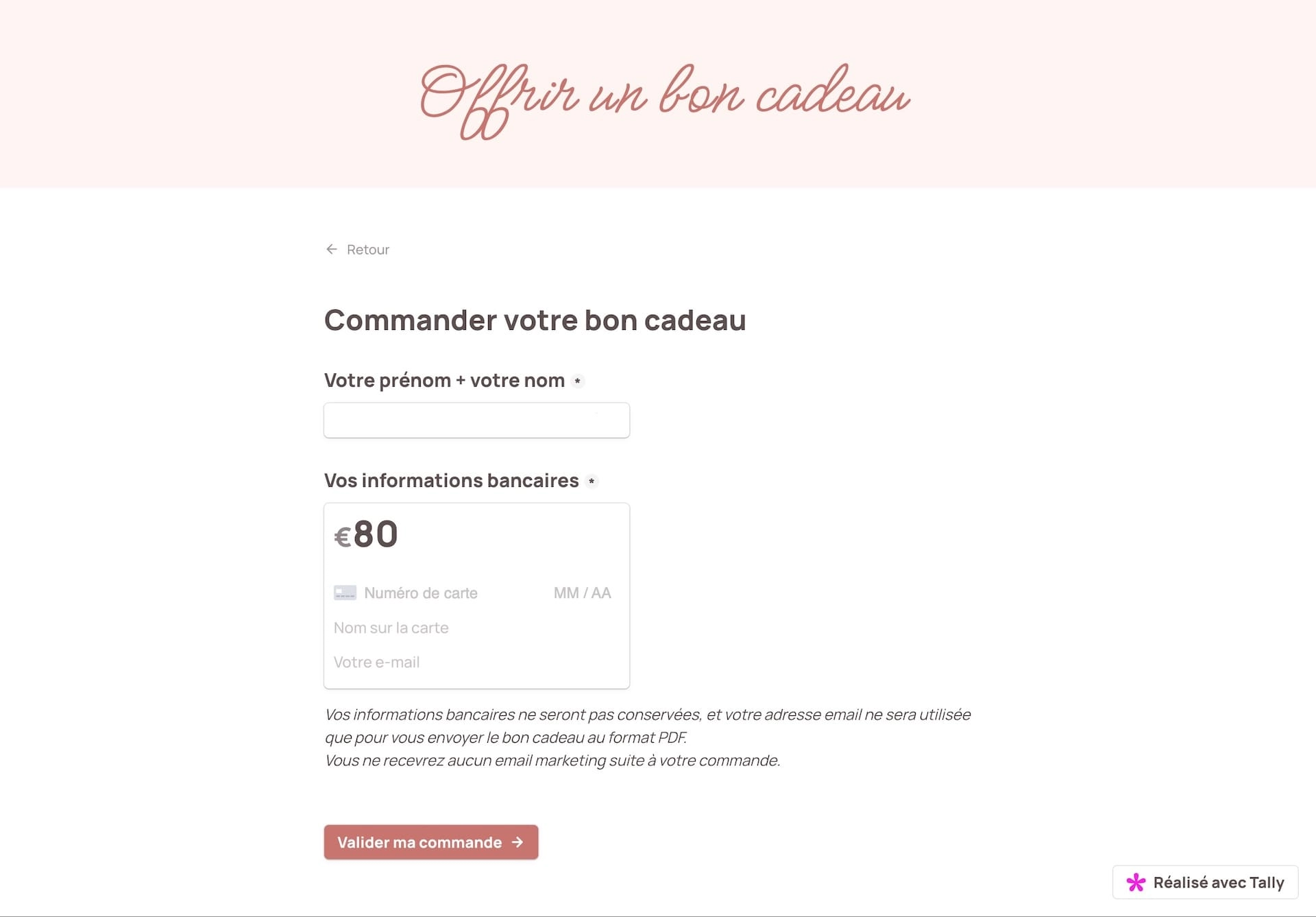 • Le client se rend sur le formulaire Tally et sélectionne le bon cadeau souhaité, puis renseigne les informations à y inclure avant de procéder au paiement sécurisé par carte bancaire via Stripe.