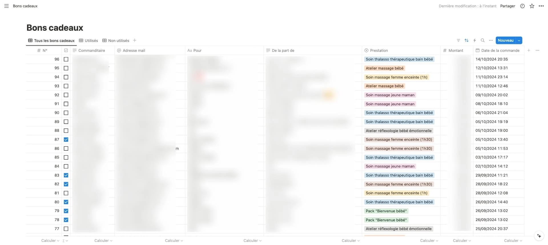 • Chaque bon cadeau est également enregistré dans une base de données Notion, permettant à Amandine de suivre les bons utilisés, de vérifier leur validité, et d’avoir une vue d’ensemble sur l’historique des commandes.